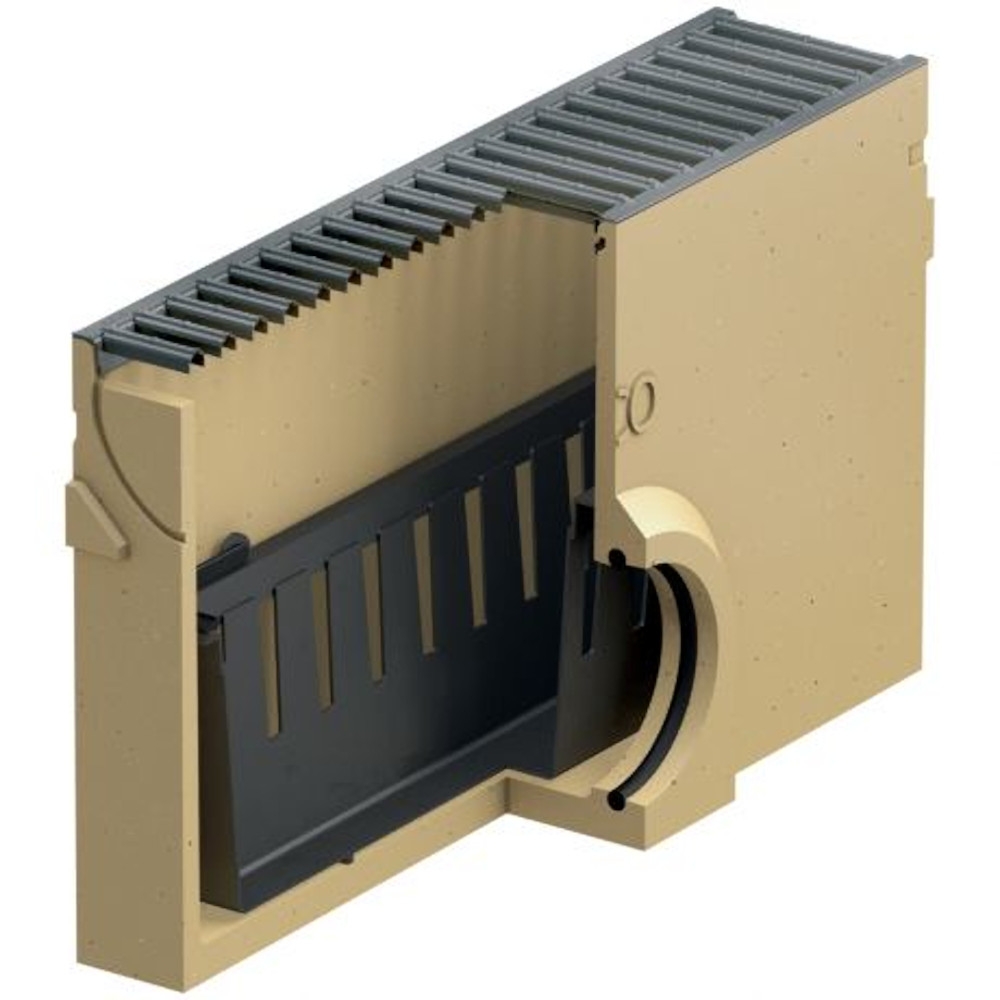 - Section en V : écoulement optimal et auto-nettoyage du fond Éléments de caniveau : polyester Grille sans vis ancrée étanchéité de la ligne de caniveau 100% étanche aux liquides Joint à lèvre intégré Ø 110mm Avec grille fendue en acier galvanisé Inclut seau noir en PP
