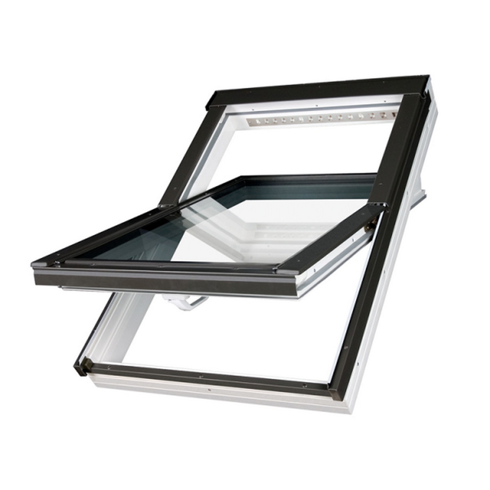 Le Fakro PTP-V est une fenêtre de toit basculante avec profilé à plusieurs chambres en PVC blanc renforcé d'éléments en acier.