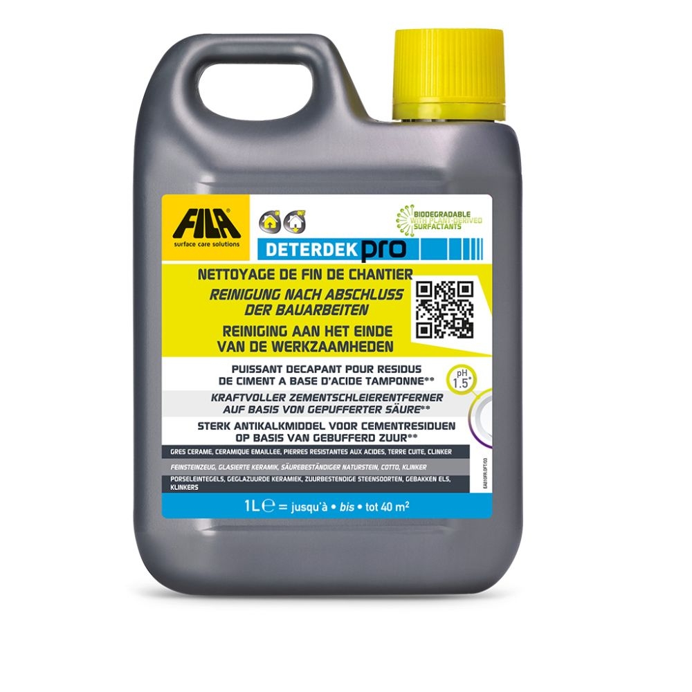 Le nettoyant Fila Deterdek Pro 1L est un agent de détartrage utilisé pendant le nettoyage à la fin des travaux.