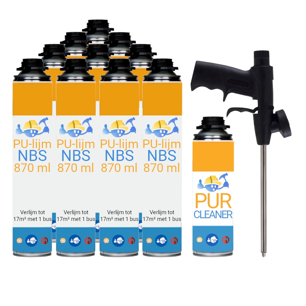 Cette combibox contient 10 bombes de colle Pu (embout NBS), 1 pistolet de pulvérisation universel NBS et un nettoyant à mousse de 500 ml.