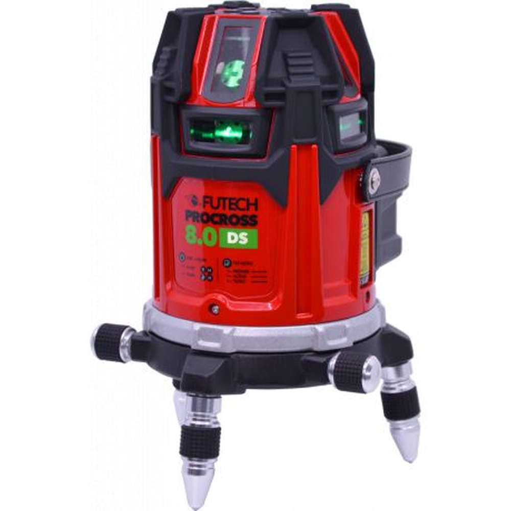Le Laser de ligne Futech Procross 8.0 DS Vert avec 4 lignes horizontales vertes et 4 lignes verticales. Nivellement motorisé avec une précision de 1mm/10m.