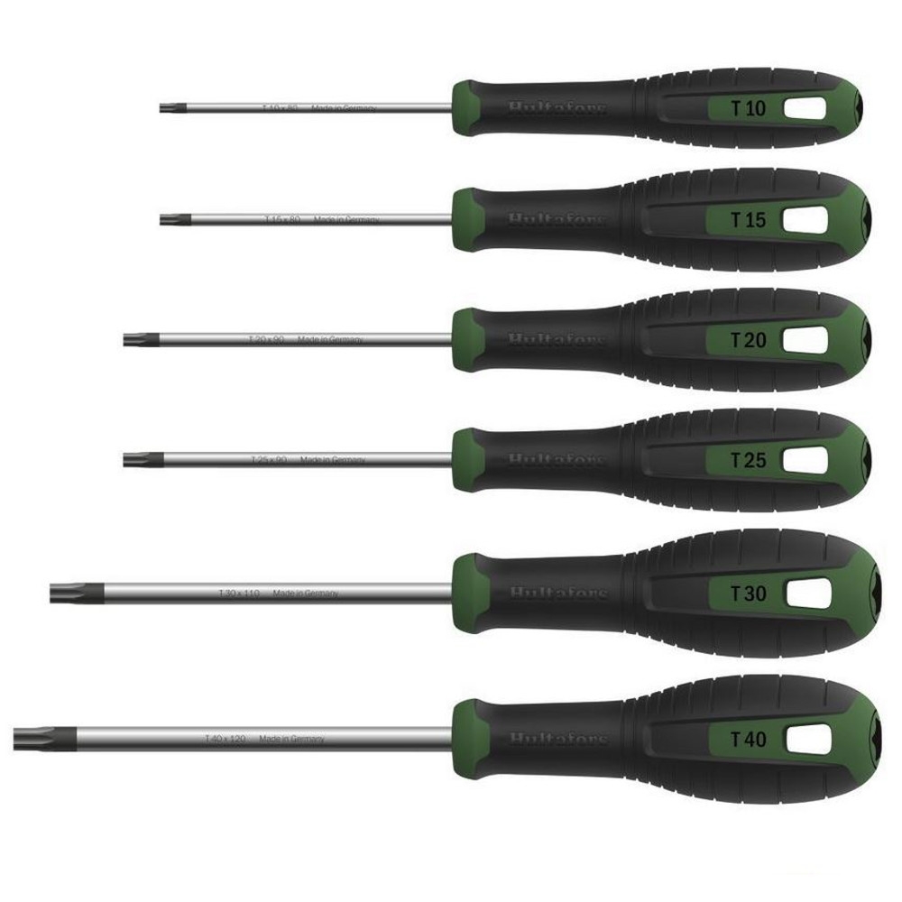 Le jeu de tournevis Torx Hultafors comprend une sélection des 6 tailles les plus courantes, y compris T 10, 15, 20, 25, 30 et 40