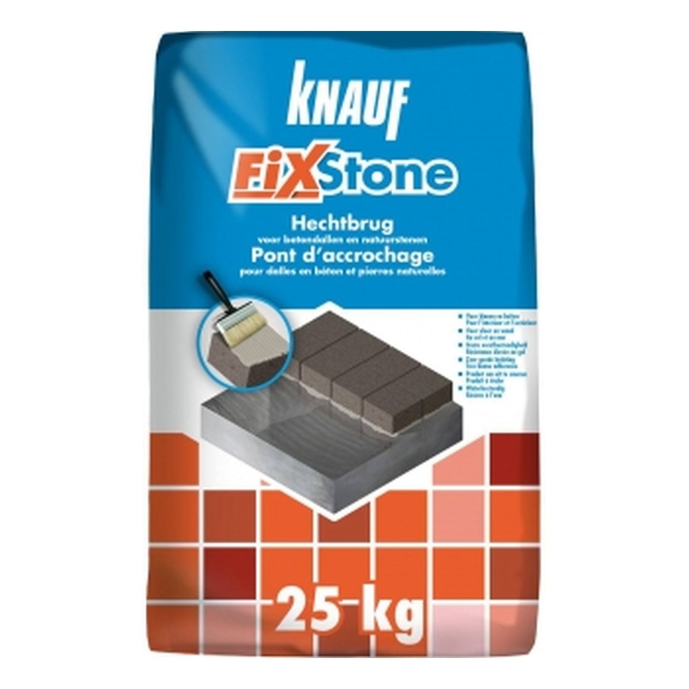 Knauf Fix Stone est un pont d'adhérence flexible à base de ciment et de résines synthétiques. Le produit durcit de manière hydraulique et n'est pas perméable à l'eau.