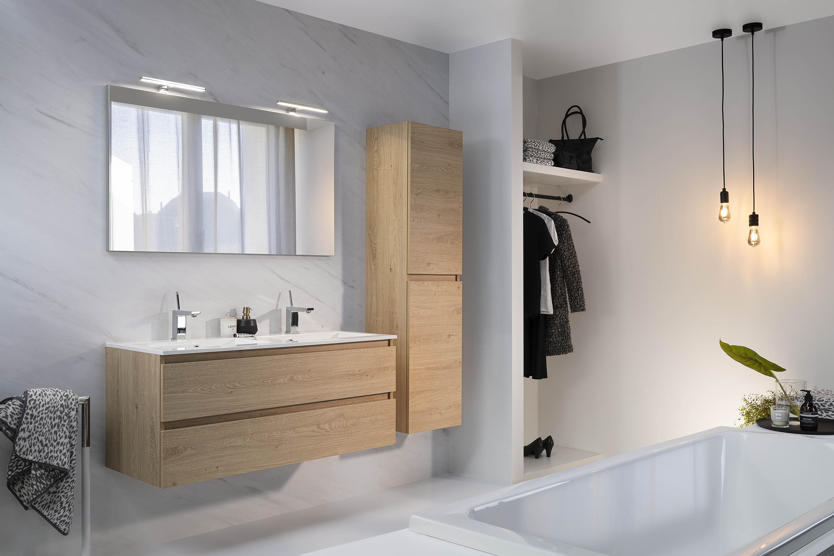 Meuble de salle de bain avec 2 tiroirs sans poignées + miroir 1200 mm chêne clair