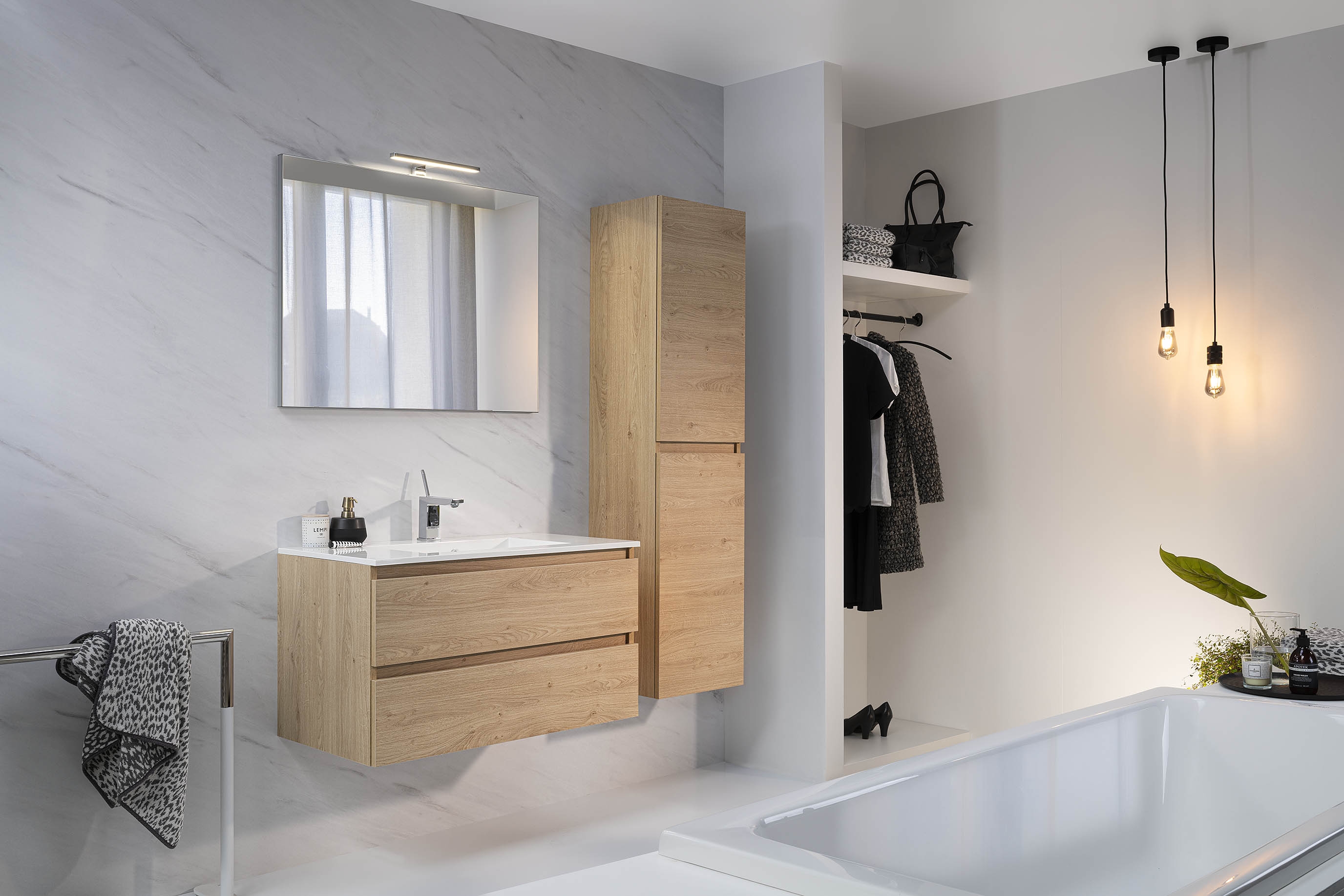 Meuble de salle de bain avec 2 tiroirs sans poignées + miroir 900 mm chêne clair