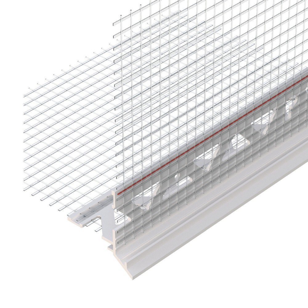 Profil de bord de goutte en PVC pour ETICS, conçu pour une finition propre et soignée, comme pour les passages isolés et les balcons. Lors de l'installation, la flèche imprimée doit pointer vers le haut. Cette flèche indique la position du drapeau, qui doit se chevaucher avec le renforcement du mur.