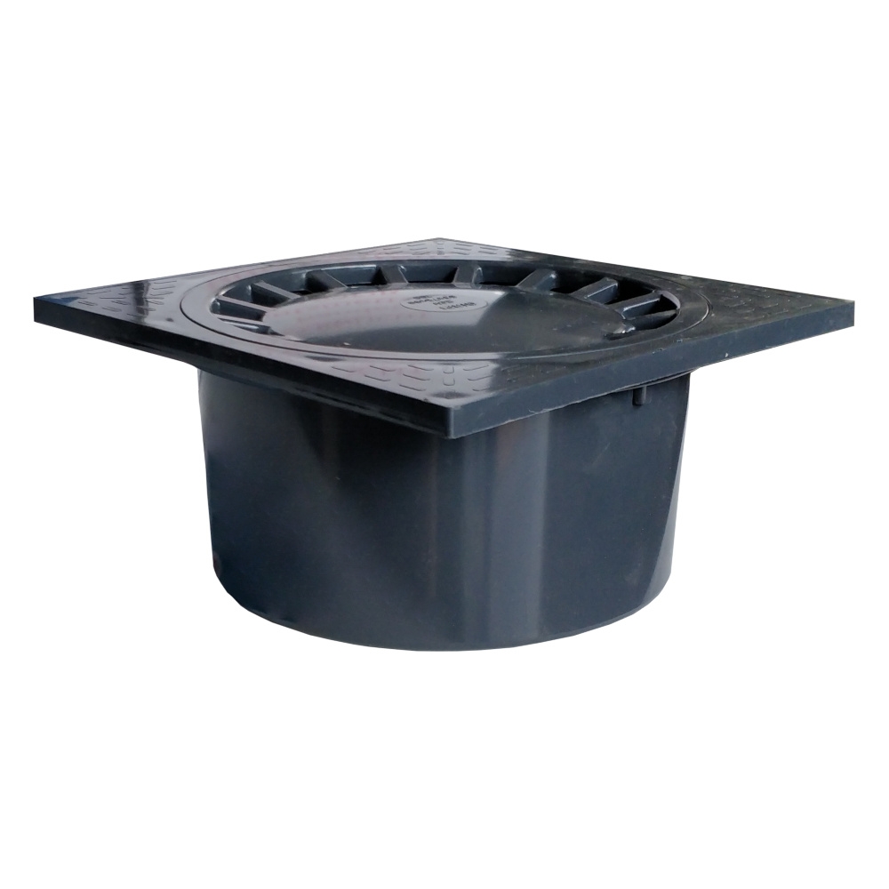 Une grille PVC (étanche aux odeurs) avec un cadre de 20cm par 20cm et un couvercle rond.
