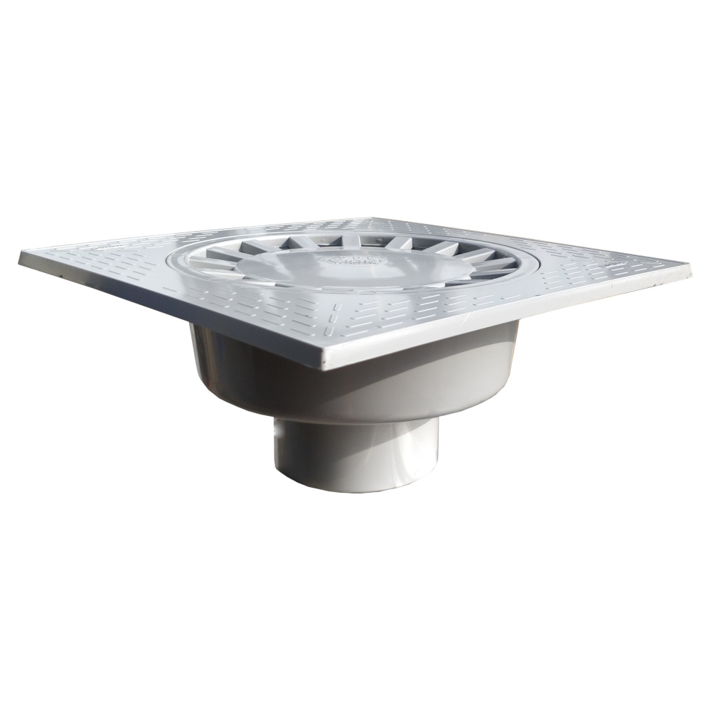 Une grille en PVC (hermétique) avec cadre de taille 30 cm sur 30 cm et couvercle rond.