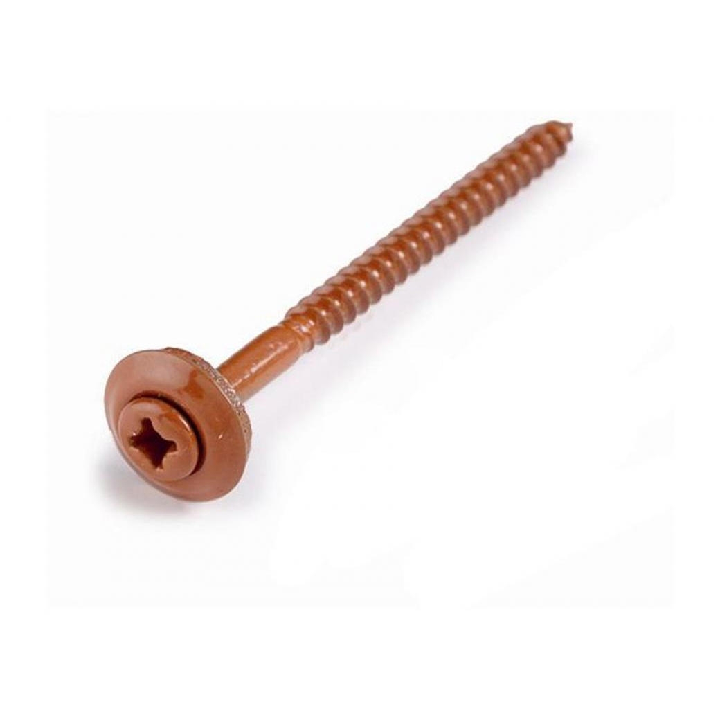 Une vis inox pour faitière et chevron avec rondelle en néoprène, revêtue de rouge, pour la fixation de tuiles de faîtage, de faitières et de chevrons.