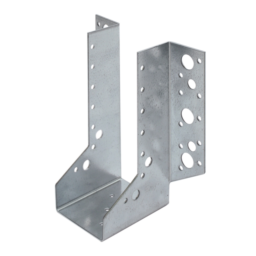 Een raveeldrager of balkdrager met nagel- en boutgaten voor bevestigingen op muren of balken.