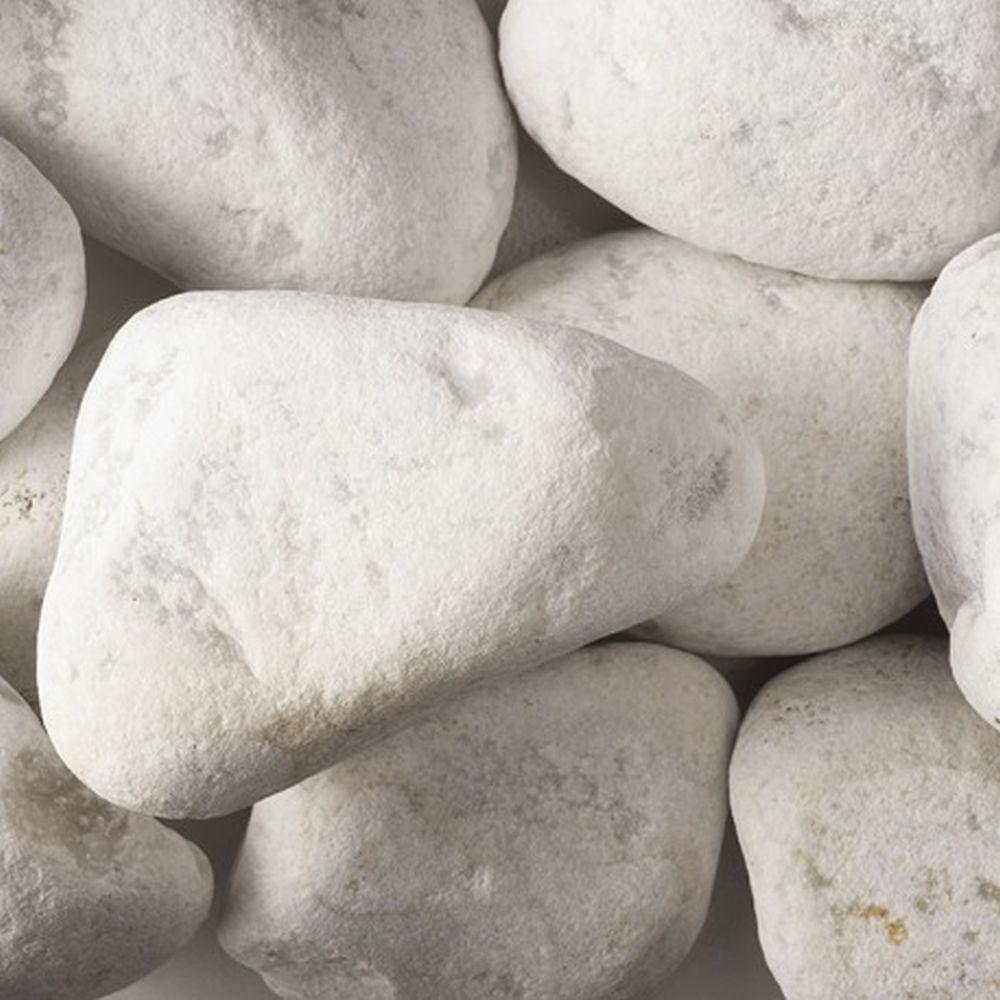 Decoratieve ronde keien van Carrara marmer, voor landscaping en decoratief gebruik alleen. Hoofdzakelijk wit van kleur, met lichte grijze ondertoon. Grotere keien zijn geschikt voor gebruik in schanskorven en steennetten.