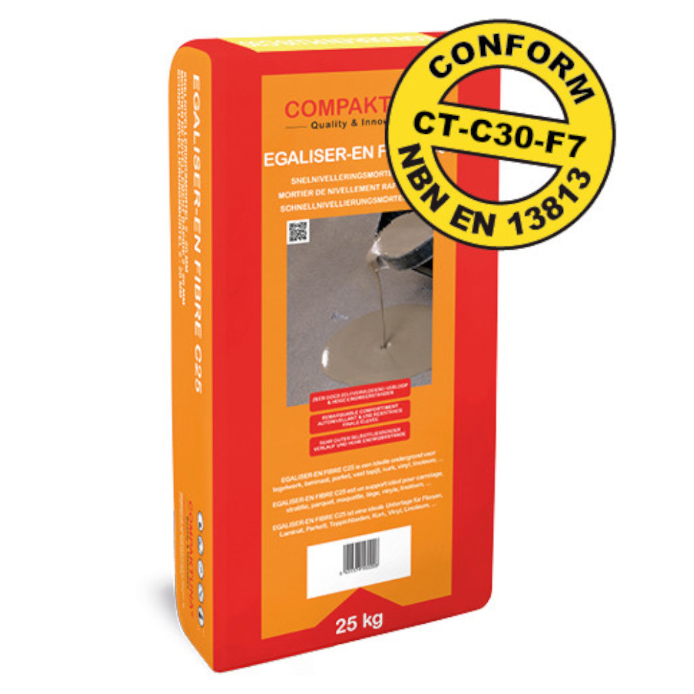 EGALISER-EN FIBRE C30 is een gebruiksklare snelnivelleringsmortel voor binnenvloeren. Door simpelweg water toe te voegen, verandert de mortel in een zelfnivellerende mortel. De korte droogtijd van EGALISER-EN FIBRE C30 vermindert de wachttijd voordat de vloer in gebruik kan worden genomen. Deze mortel is geschikt voor het egaliseren van oneffenheden variërend van 3 mm tot 30 mm in één enkele laag.