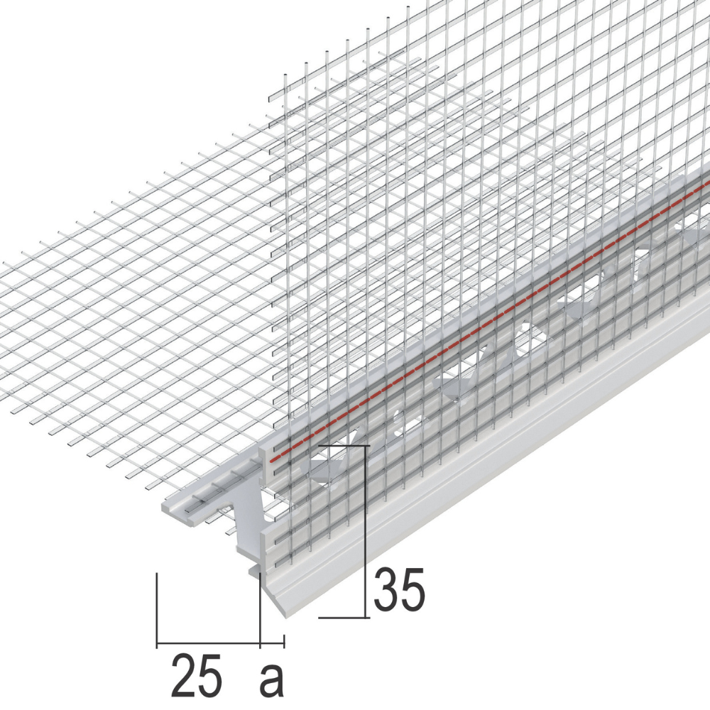 Druppelrandprofiel van PVC voor ETICS, ontworpen voor een nette en strakke afwerking, zoals bij geïsoleerde doorgangen en balkons. Tijdens de installatie moet de bedrukte pijl naar boven wijzen. Deze pijl geeft de positie aan van de doekvlag, die overlapt moet worden met de gevelwapening.