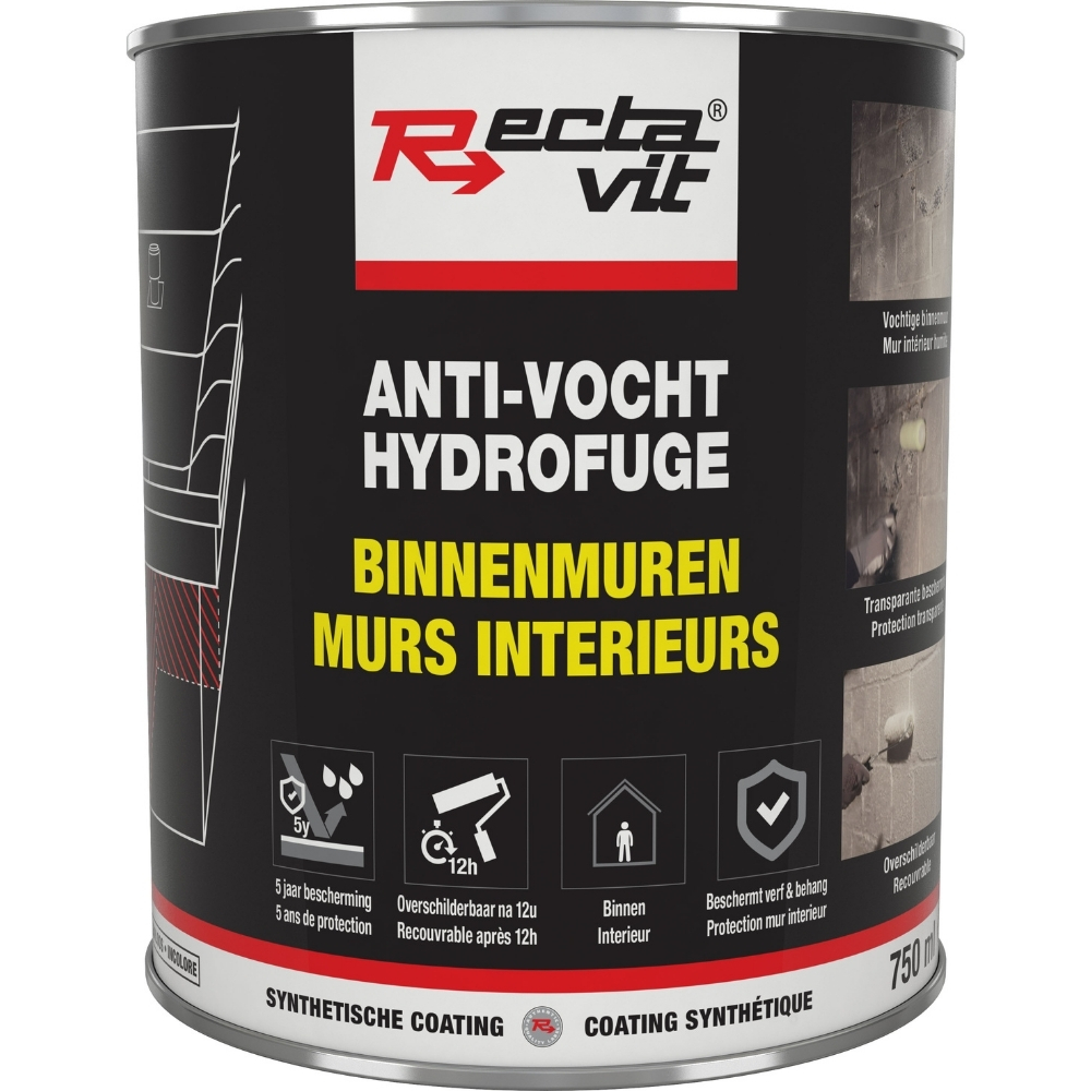 Rectavit Anti-Vocht voor binnenmuren is een kleurloze synthetische coating die vochtdoorslag en vocht kan voorkomen in bovengrondse binnenmuren op pleisterwerk, beton, steen, cement en zo voort. Aanbrengen met een blokborstel.