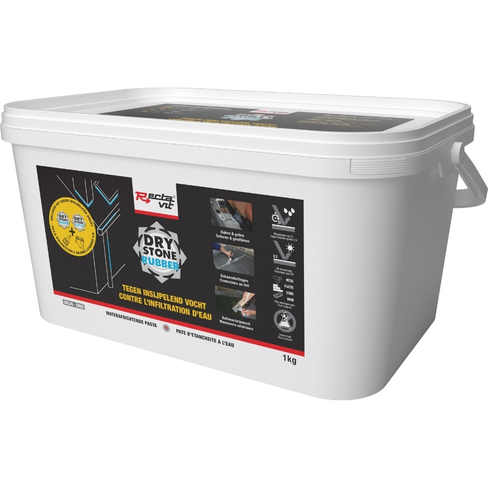 De hybride waterafdichtende pasta DryStone rubber voor het tegenhouden van insijpelend vocht via daken en goten, bij dakaansluitingen, voor buitenschrijnwerk,...