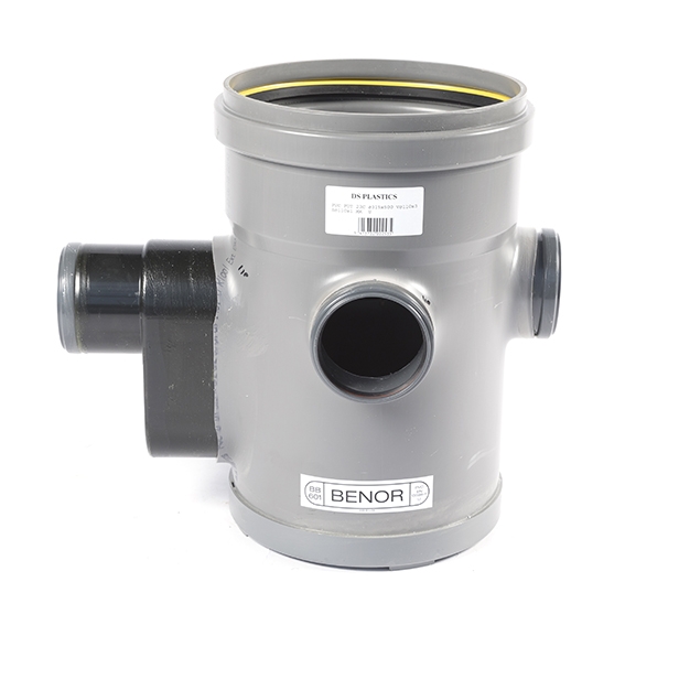 Een PVC sifonput type 23C met diameter 315 mm en 3 x 110 doorvoeren, 1 x 110 sifondoorvoer.