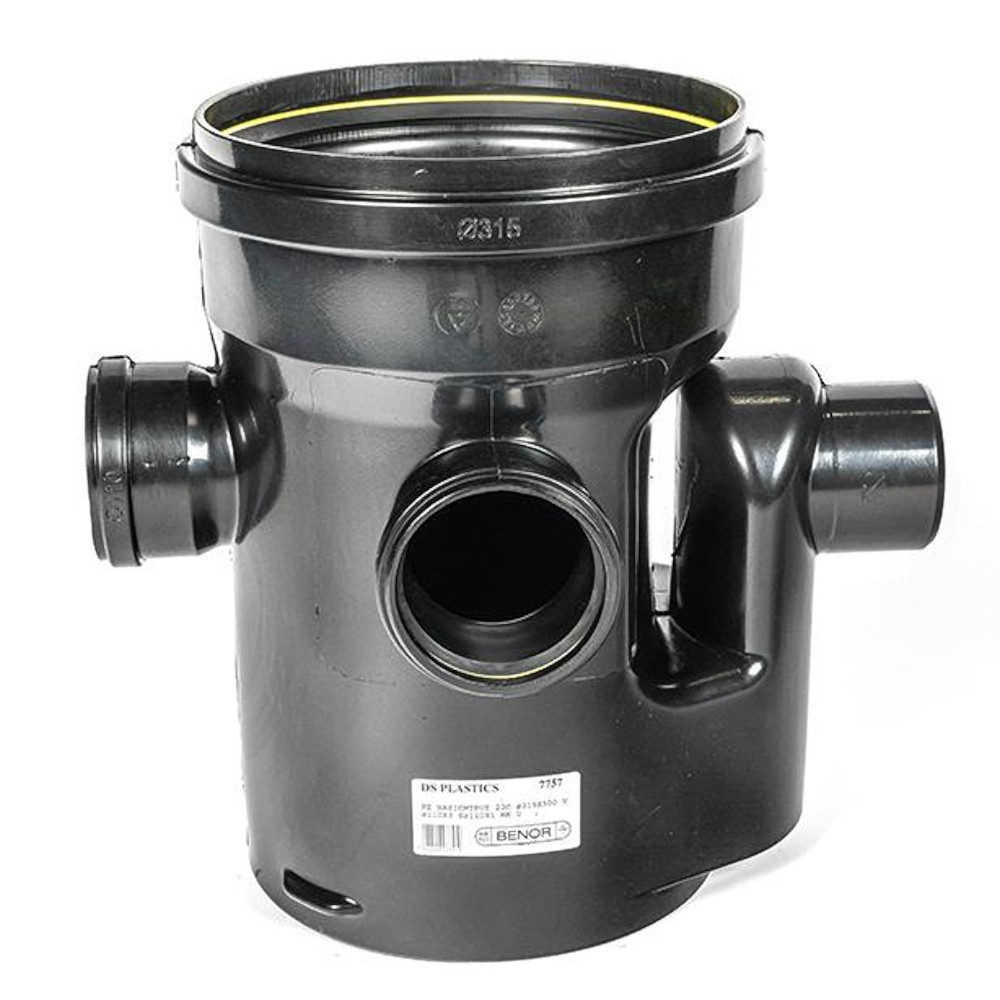 Een PE sifonput met diameter 315 mm en 3 x 110 doorvoeren, 1 x 110 sifondoorvoer.