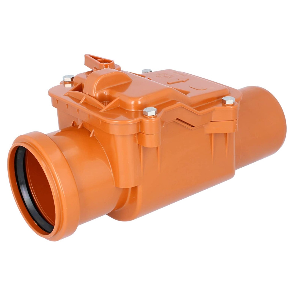 Terugslagklep voor riolering Ø110 met vergrendelfunctie die het onderhoud vergemakkelijkt