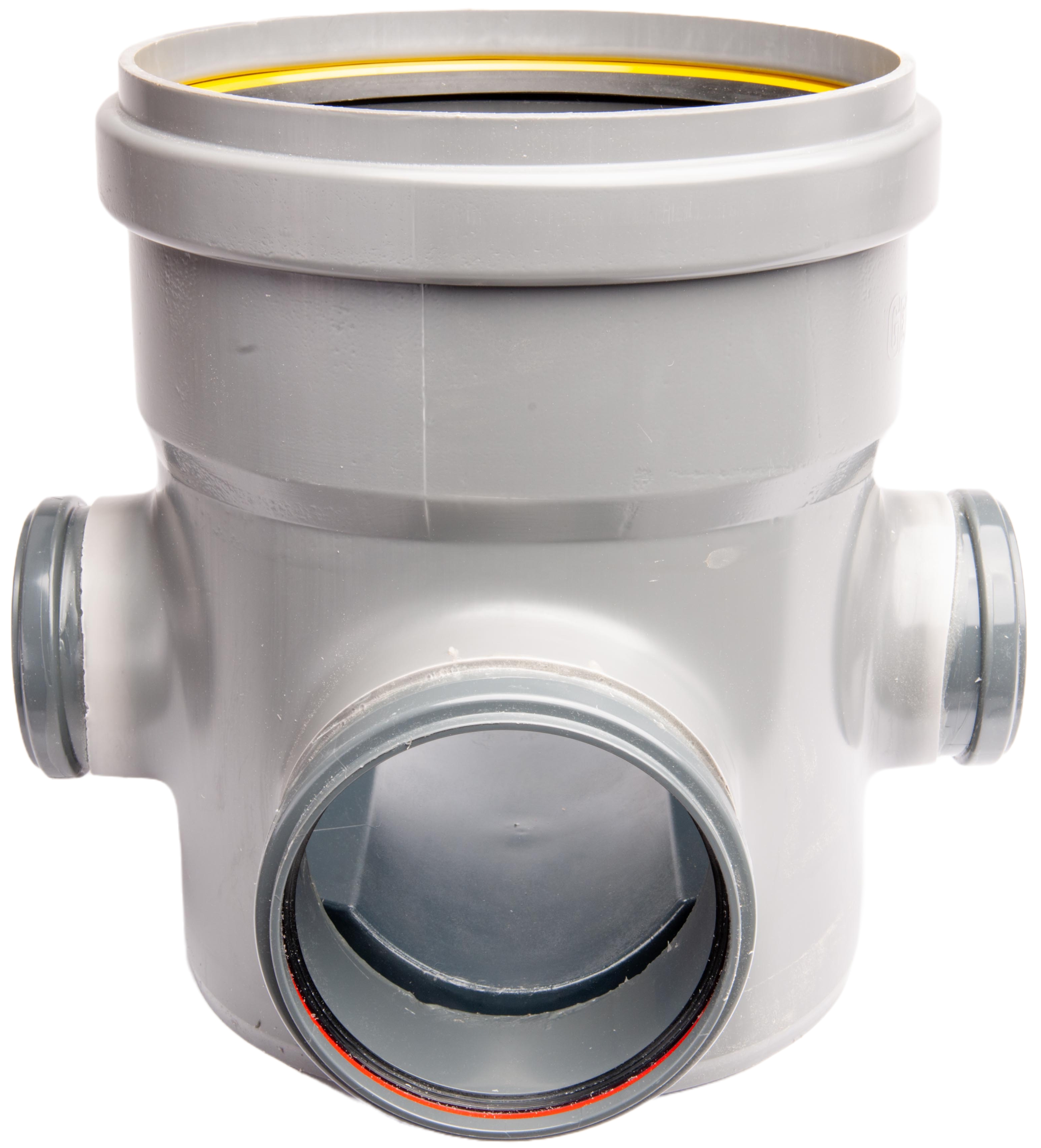 Een PVC toezichtput met rubber dichting en diameter 315 mm en 3 x Ø110 mm / 1 x Ø160 mm doorvoeren