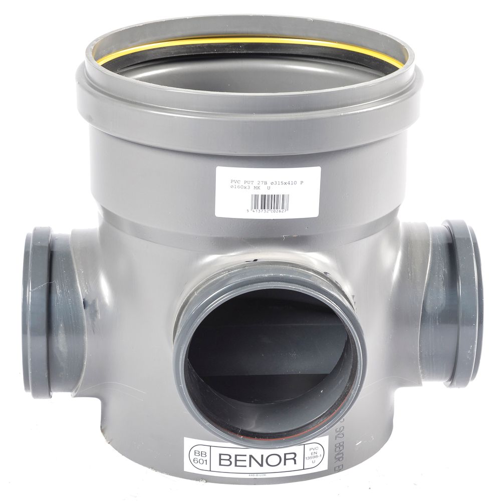 Een PVC toezichtput met diameter Ø315 mm en 3 x Ø160 doorvoeren.